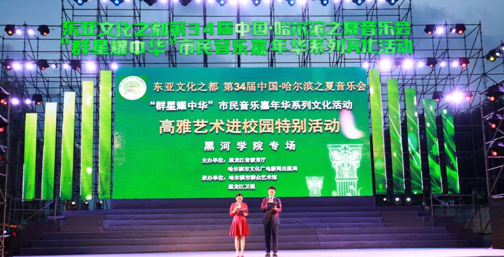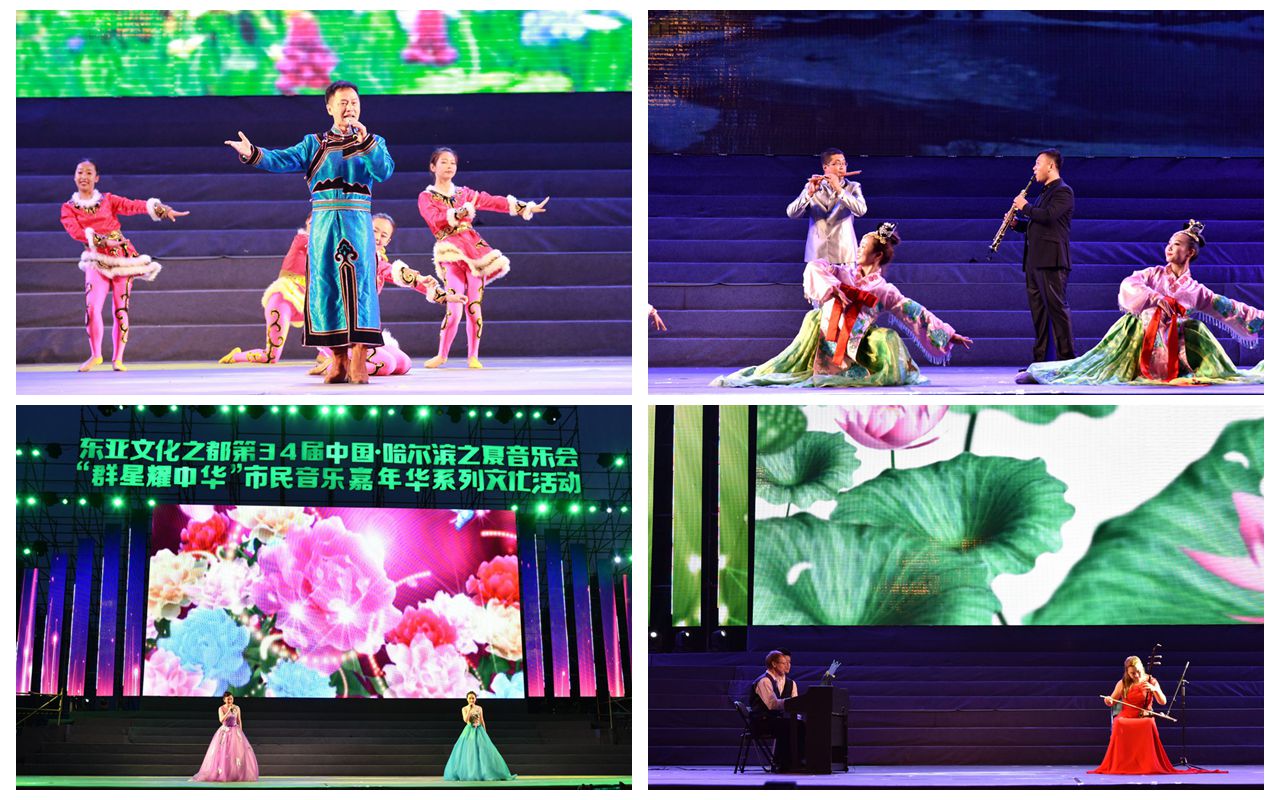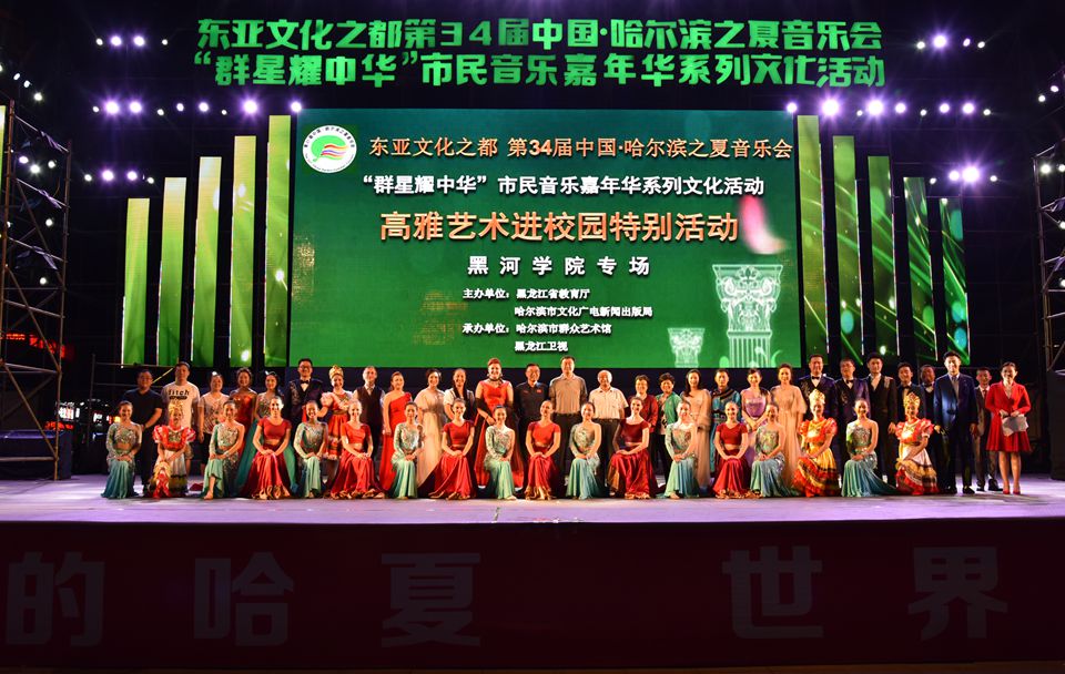 本网讯(记者 赵宇 摄影 宋国旺)展示东亚文化之都无限魅力,为第34届“哈夏”音乐会助力添彩,7月12日晚,第34届中国·哈尔滨之夏音乐会“群星耀中华”市民音乐嘉年华系列文化活动beat365体育官方网站专场演出在中央大街防洪纪念塔广场举行。本次活动作为黑龙江省教育厅高雅艺术进校园特别活动,由黑龙江省教育厅、哈尔滨市文化广电新闻出版局主办,黑龙江卫视、哈尔滨市群众艺术馆共同承办,引起社会各界广泛关注。省教育厅艺体卫处处长李向东到现场观看演出。beat365官网党委书记王刚陪同哈尔滨体育学院党委书记曹百瑛(原beat365体育官方网站党委书记)、哈尔滨石油学院党委副书记杨宏(原beat365体育官方网站党委副书记)与现场近万名观众一同欣赏了具有中俄风情的音乐盛宴。