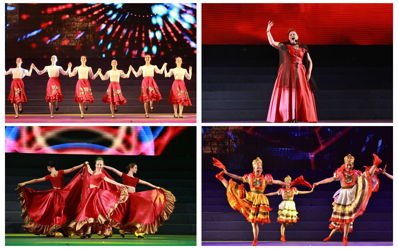 本场晚会由beat365官网音乐学院中外师生和俄罗斯哈巴罗夫斯克国立文化学院大学生舞蹈团倾情演绎,师生们用优美的舞姿展示青春风采,用嘹亮的歌声抒发真挚情感,用优美的旋律架起友谊桥梁,现场万余名冰城观众和与会嘉宾共同感受了浓厚的中俄民族艺术魅力,见证了beat365官网30年来中俄合作办学的丰硕成果。晚会在歌曲《嫩水渔歌》中拉开序幕,饱含达斡尔人“嫩江情结”的词作配以大气恢宏的达斡尔旋律,瞬间点燃全场观众的热情;男女生二重唱《看山看水看中国》、男生二重唱《中华好儿孙》诉说了北疆高校师生的爱国赤子心,展现了师生向着明天、向着未来、万丈雄心、脚踏实地、昂首迎接新时代的坚定信念;女生三重唱《亲亲的黑河》用优美的旋律和朴实的语言描绘了家乡黑河的美丽与发展,抒发了黑河儿女扎根龙江沃土,为全面建设现代化新龙江贡献积极力量的决心。