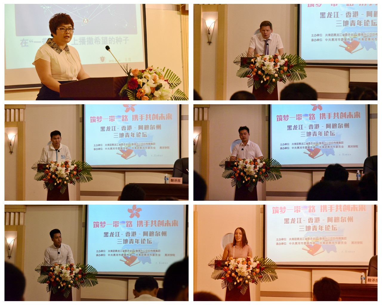 中共黑河市委副秘书长张世华在讲话中指出,黑河和布拉戈维申斯克是一江两岸的好伙伴,而黑河和香港则是一南一北两颗明珠,本次黑龙江—香港—阿穆尔州三地青年论坛在黑河市召开,是对黑河作为对俄人文交流与合作前沿的认同和肯定。今年是中国改革开放四十周年,也是中俄两国元首共同确定的中俄地方合作交流年,他希望,通过此次论坛,能为黑龙江—香港—阿穆尔州三地青年学子提供一个对接平台,搭建一座友谊桥梁,唱响一次心灵共鸣,让三地青年共同筑梦“一带一路”,携手开创更加美好的明天。