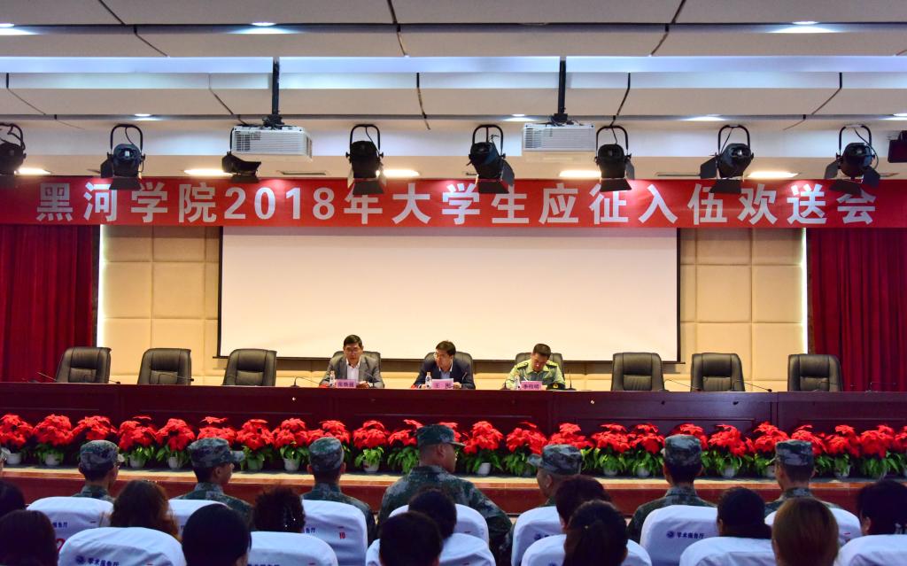 本网讯(记者 关月 摄影 彭博)携笔从戎,矢志军营。9月10日上午,学校在求知楼报告厅举行2018年大学生应征入伍欢送会。党委书记王刚、副校长张焕强,黑河市爱辉区武装部部长李伟明上校,党委(校长)办公室、学生工作部(处)·武装部、保卫处等相关部门负责人及各学院党总支书记、副书记和辅导员代表参加了欢送会。