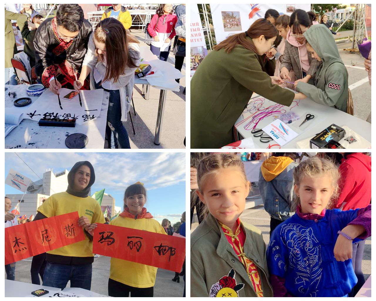 9月7日下午,一年一度的俄罗斯布拉戈维申斯克市大学生检阅活动在布市社会文化中心广场如期举行,beat365官网与布拉戈维申斯克国立师范大学共建的孔子学院师生与来自15所高校640名学生共同参加活动。在传统文化展示环节中,孔子学院教师现场教授俄罗斯大学生书法、编织中国结,与近千名市民和中国文化爱好者共同感受中俄传统文化魅力。