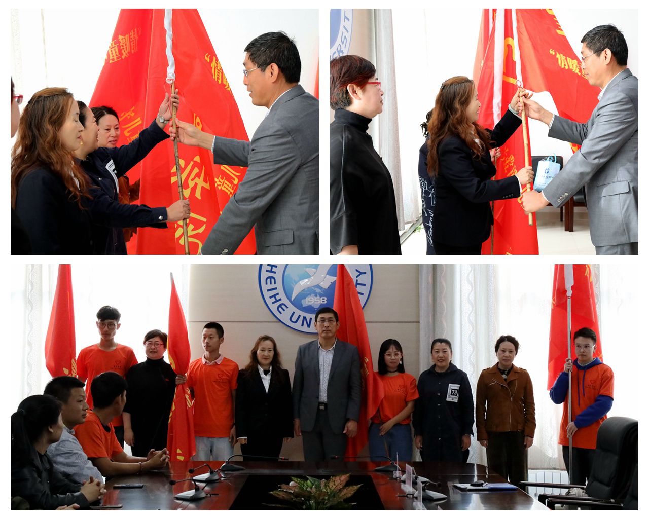 | (副校长张焕强为即将出征的四个学院授旗) |