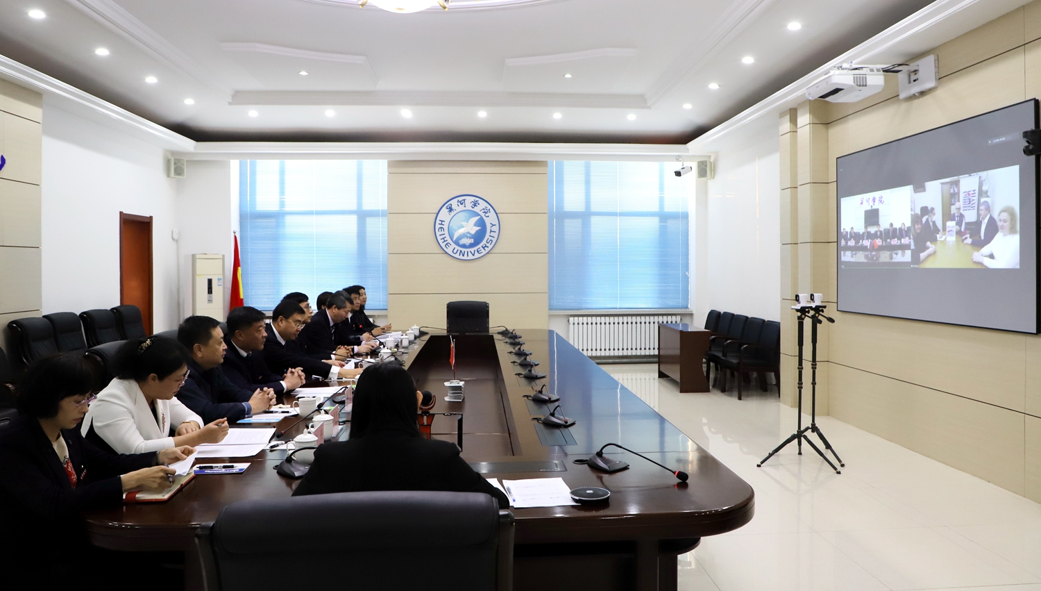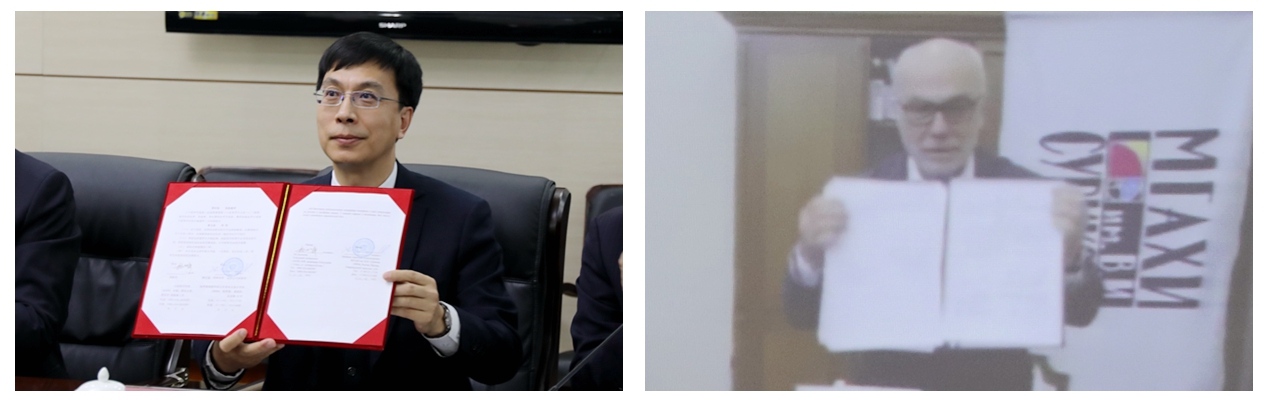 仪式上,杨敬民校长与阿纳托利·亚历山大洛维奇·柳巴温校长“云端”签署合作协议。根据协议,两校将在人才培养、教师互访、合作办学等方面开展深入合作。
