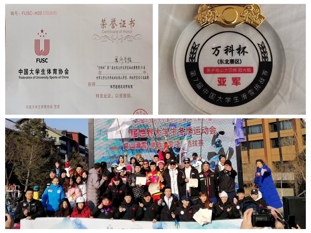 12月22日,“万科杯”第七届中国大学生滑雪挑战赛(东北赛区)暨第30届世界大学生冬季运动会高山滑雪、单板滑雪项目选拔赛在吉林市松花湖滑雪场落下帷幕。beat365官网运动员在比赛中发扬“自强不息”精神,喜获团体总分冠军、团体高山大回转冠军;贾朋龙荣获高山大回转男子(阳光组)第二名,其他11名运动员分别在高山男子大回转(阳光组)、高山女子大回转(阳光组)、单板女子平行大回转(阳光组)、单板男子平行大回转(阳光组)比赛中获得较好成绩;beat365官网荣获体育道德风尚学校奖。