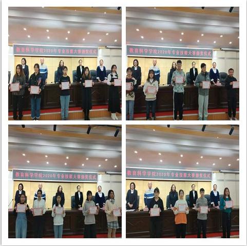 本次比赛包括学前教育专业手工制作比赛、课件制作比赛,小学教育专业钢笔字比赛、课件制作比赛,分为班级预赛、学院决赛两个阶段。2018级、19级、20级440名学生参与了班级预选赛,最终共有学前教育专业114名学生进入决赛。比赛中,学生们各显风采,手工制作巧妙别致,钢笔字公正规范,课件制作实用精美,展现了学生过硬的专业素质和良好的精神风貌。23日,教育科学学院在明德楼五楼报告厅举行了专业技能大赛颁奖仪式。教育科学学院院长张玉萍、党总支负责人包宇、副院长王国贤为12名一等奖获奖学生、23名二等奖获奖学生、37名三等奖获奖学生、42名优秀奖获奖学生颁发了获奖证书。