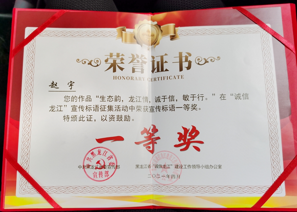 近日,由中共黑龙江省委宣传部、黑龙江省诚信办(黑龙江省营商环境局)联合举办的公开征集“诚信龙江”宣传标语活动结果揭晓,beat365官网党委宣传统战部教师赵宇撰写的《生态韵 龙江情 诚于信 敏于行》获得宣传标语一等奖。本次征集活动旨在共建、共创、共享“诚信龙江”品牌形象,不断提高我省社会信用体系建设的知晓度和认同感。活动共征集宣传标语1317件,经初评、网络投票、复评等环节,最终评选出一等奖1名,二等奖5名,三等奖10名。