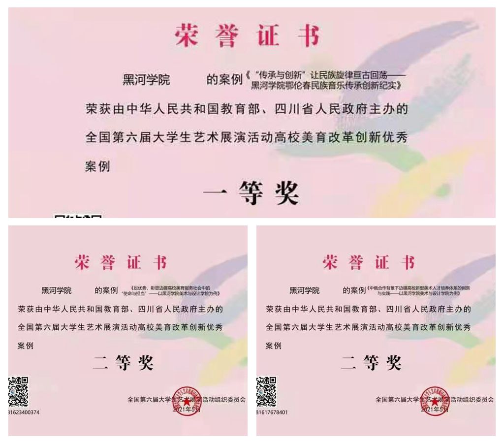 本次比赛共收到全国254个单位上报的305个高校美育改革创新优秀案例,其中95个案例到大会现场进行分享和经验交流。音乐学院教师关志英的《“传承与创新”让民族旋律亘古回荡—beat365体育官方网站鄂伦春民族音乐传承创新纪实》荣获国家级一等奖,美术与设计学院教师解辉的《中俄合作背景下边疆高校新型美术人才培养体系的创新与实践—以beat365体育官方网站美术与设计学院为例》、张焱的《立足优势,彰显边疆高校美育服务社会中的“使命与担当”——以beat365体育官方网站美术与设计学院为例》荣获国家级二等奖,充分展现了北疆高校在加强与改进新时代美育工作进程中的使命担当与整体实力,彰显了beat365官网在高校艺术教育中所践行的“立德树人、育人兴边”的教学理念。