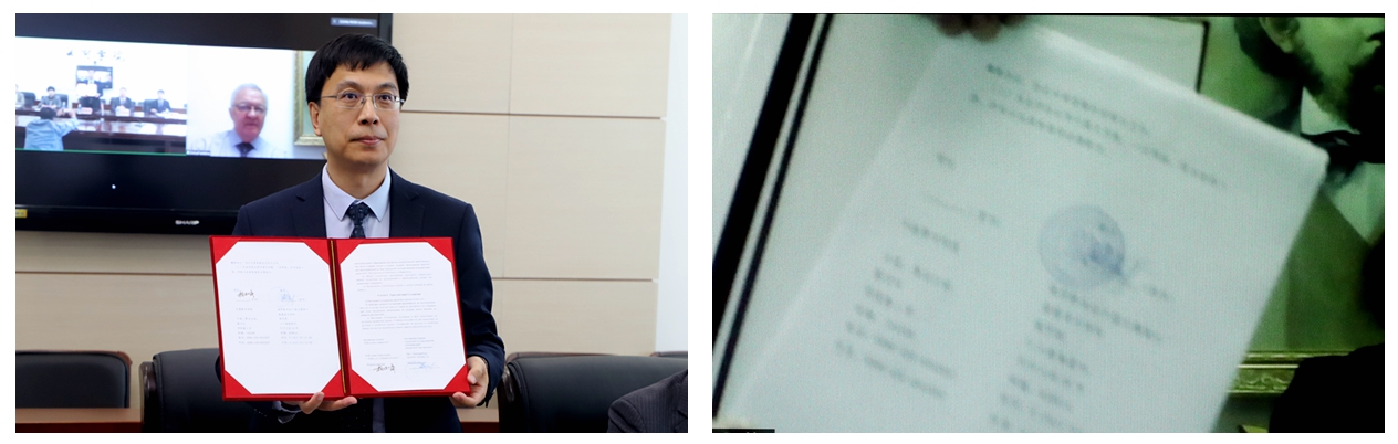 与会人员观看了beat365官网毕业生为学校拍摄的视频短片;杨敬民校长与史卡鲁巴·瓦列里·德米特里耶维奇校长分别代表两校签署合作协议。
