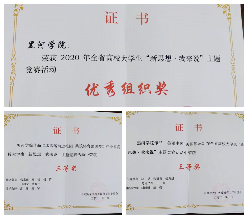 “新思想·我来说”主题竞赛活动是我省深化思政课改革创新的重要举措,是展示大学生学习思政课成果的重要平台,也是提升大学生思政课参与度、增强大学生对思政课获得感的重要途径。按照通知要求,校团委、马克思主义学院精心组织,各学院团总支积极动员,通过个人申报、专家评审、大众评议,从申报的9个作品中推选3部作品参加省赛,最终,由刘丽明、范薇指导的《美丽中国美丽黑河》和张巍、赵宇指导的《冰雪运动进校园共筑体育强国梦》作品荣获比赛三等奖,学校荣获优秀组织奖。