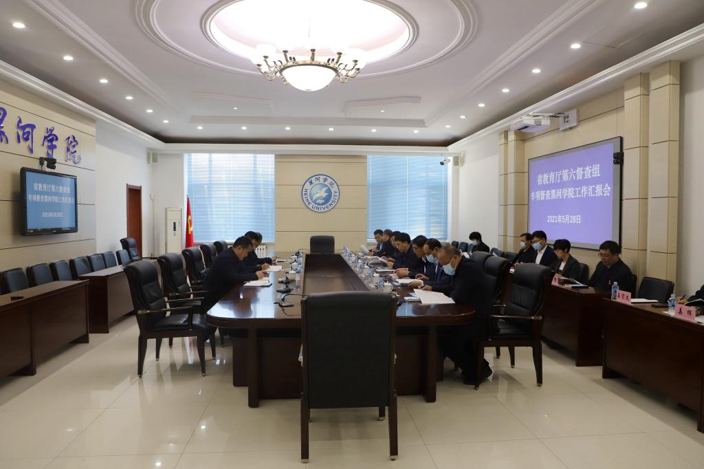 本网讯(记者 赵宇 摄影 周春晓)5月28日,以省教育厅督学李长福(副厅长级)为组长,督导室三级调研员王月华、安全处四级调研员赵永强为组员的省委教育工委党史学习教育巡回指导第六督查组来beat365官网检查指导工作。党委班子成员、学校党史学习教育领导小组办公室、相关部门负责人参加汇报会。会议由党委副书记、校长杨敬民主持。
