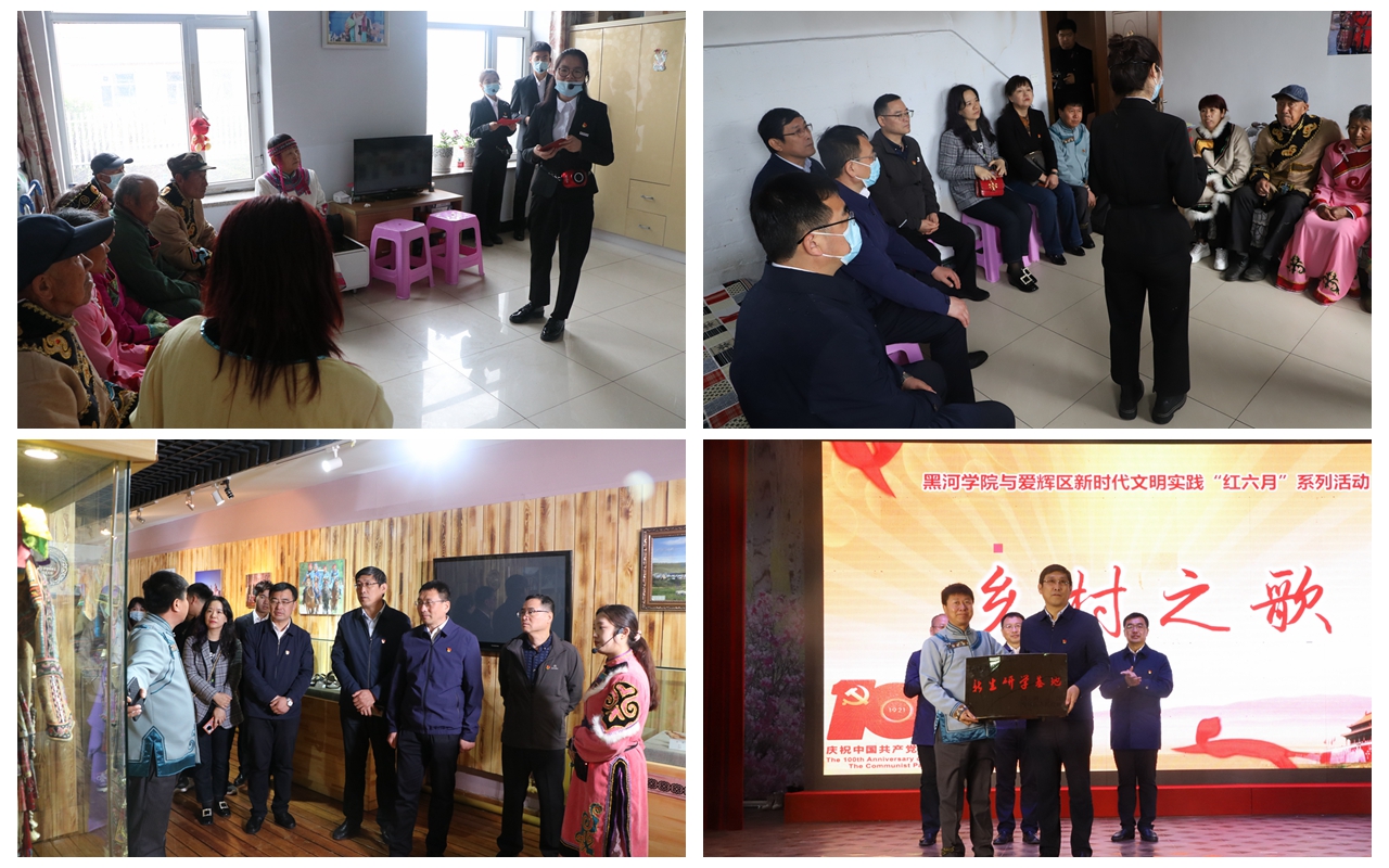 在老乡家中,大学生党史宣讲团成员、文化旅游学院学生们为鄂伦春族乡民深情讲述了百年党史的发展脉络和一个个黑河地区鲜活的党史故事,乡民们认真聆听,不时点头赞许,纷纷表示此次宣讲让他们聆听了党史故事、精神上经受了一场红色文化洗礼。活动开始前,师生们在新生乡党委书记梁志友的带领下参观了岭上人家博物馆,了解鄂伦春民族的文化和历史,聆听新生乡几十年来的发展变迁,感受着新农村的生机与活力。活动现场还举行了beat365体育官方网站与爱辉区联合建立“新生研学基地”授牌仪式,进一步加强院区合作共建,拓宽合作模式。