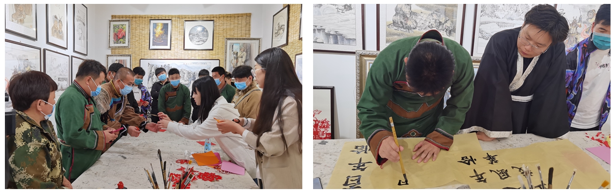 “我们对这张纸进行对折,然后折出折痕,用我们的剪刀在折痕这一边进行入剪,剪一个圆形,要求刀口流畅,不能有毛边。”来自美术与设计学院的书法学、美术学教育专业的学生们,铺好宣纸、备好剪刀、蘸好笔墨,现场教乡民们临摹、剪纸,笔酣墨饱的书画作品和栩栩如生的剪纸作品,表达出村民对建党百年的真挚祝福和美好未来的无限憧憬。