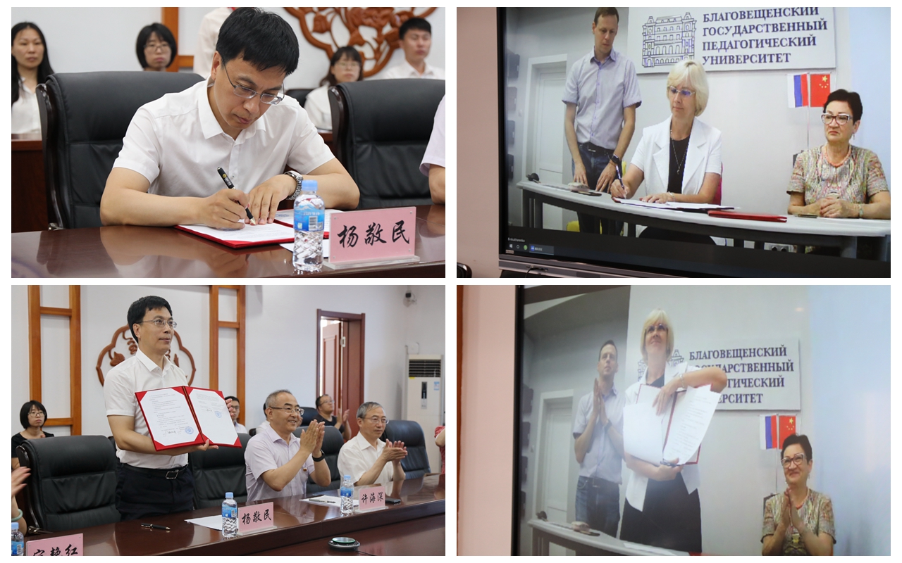 会上,校长杨敬民与布师大校长谢基娜·薇拉·维塔里耶夫娜分别代表两校通过网络视频签署共建远东图书资源中心协议。