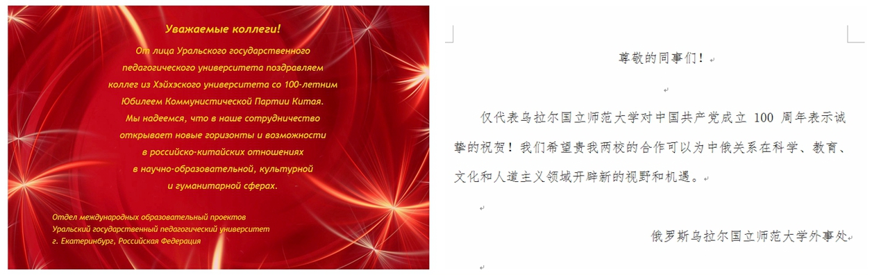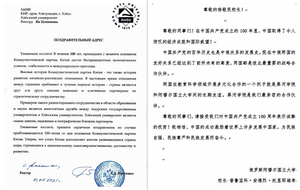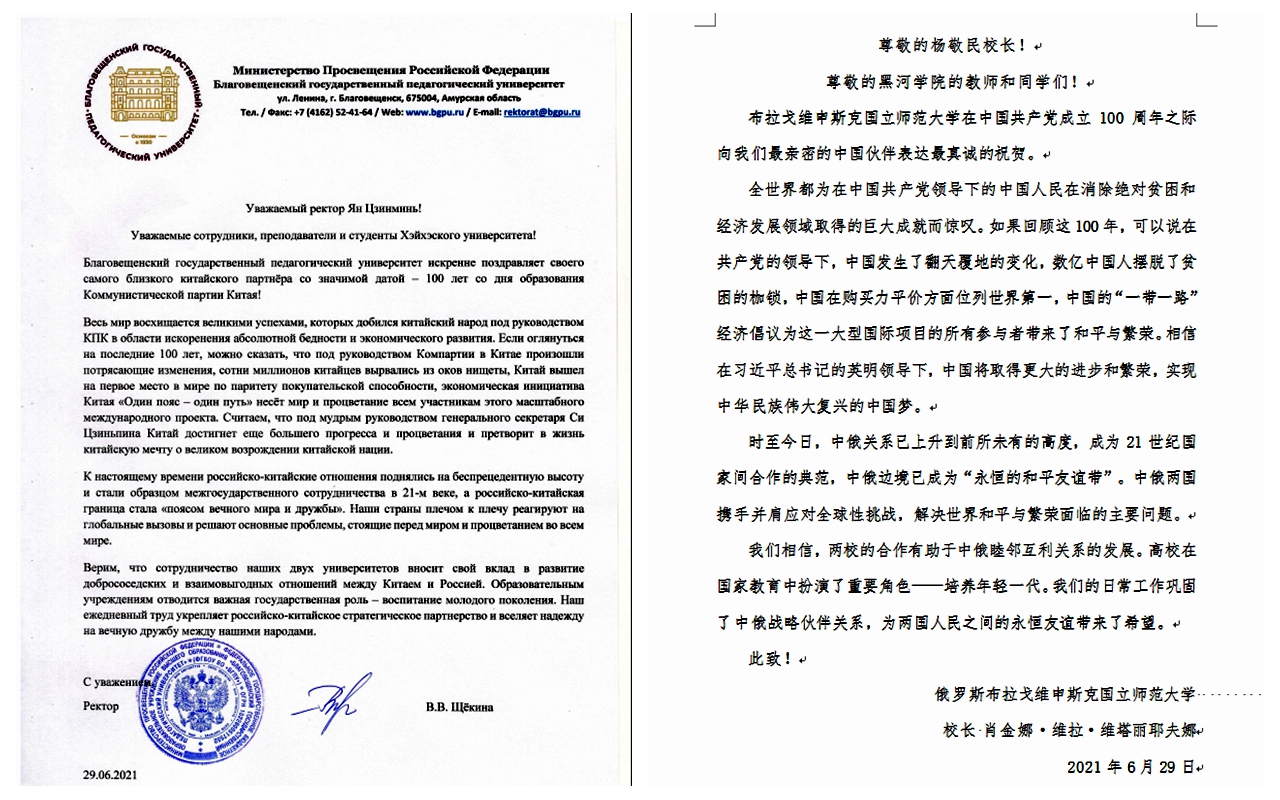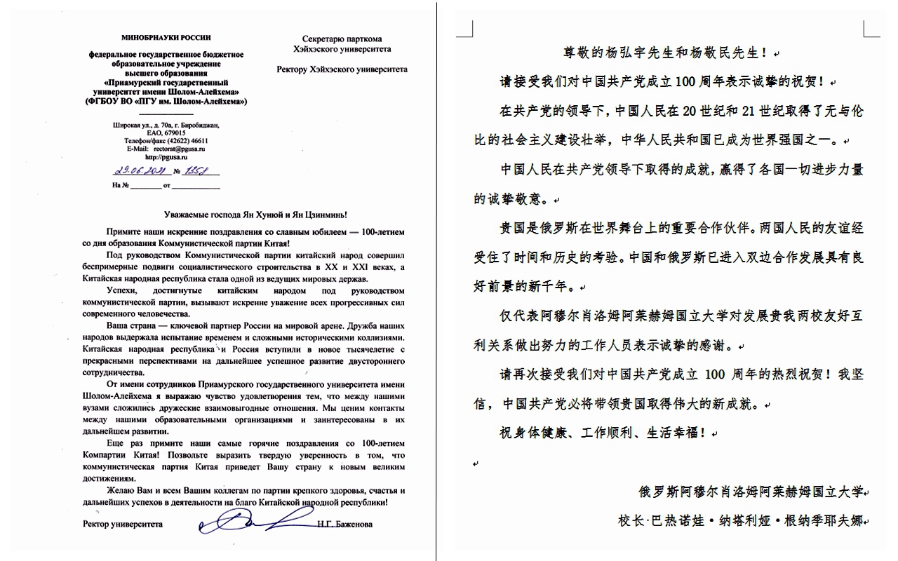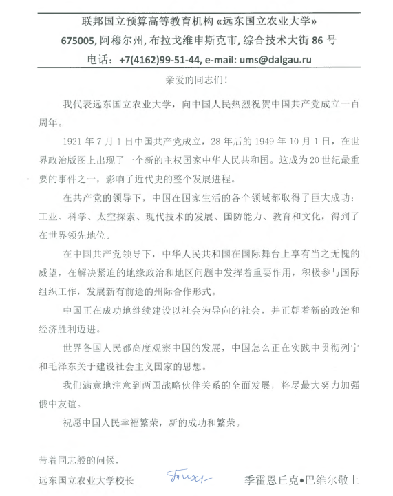 在中国共产党成立100周年之际,与beat365官网友好交往的俄罗斯布拉戈维申斯克国立师范大学、俄罗斯阿穆尔肖洛姆·阿莱赫姆国立大学、俄罗斯乌拉尔国立师范大学、俄罗斯阿穆尔国立大学、俄罗斯远东国立农业大学纷纷向beat365官网发来贺信,祝贺中国共产党成立100周年。