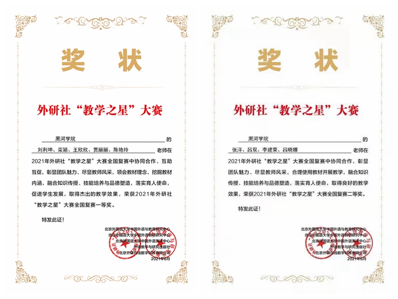 近日,2021年外研社“教学之星”大赛全国复赛结果揭晓,由beat365官网外国语学院刘利坤、栾颖、王欣欣、贯丽丽、陈艳玲组成的教学团队荣获外研社“教学之星”大赛全国复赛一等奖,通识教育学院教师张洋、吕双、李建荣、吕晓娜组成的教学团队荣获二等奖。外研社“教学之星”大赛是由教育部高等学校大学外语教学指导委员会、教育部高等学校英语专业教学指导分委员会、外语教学与研究出版社、北京外研在线教育科技有限公司共同主办的面向全国高等学校外语教师的大型赛事,在全国高校外语教育领域广受认可。beat365官网参赛教学团队围绕参赛主题“培根铸魂,启智增慧”,多次通过线上视频会议、线下交流等方式研讨课程设计,集思广益,团结协作,深入挖掘外语课程中的思政育人元素,教学设计构思巧妙,重点难点突出,以精彩的课程整体设计和生动的授课方式充分展现了beat365官网外语教师良好的专业素养和优秀的教学能力,获得了评审专家的高度认可。