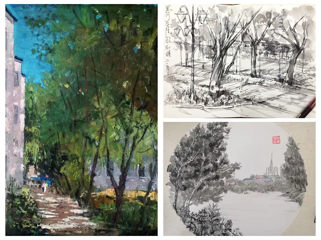 “虽然因为疫情影响不能实现外出写生的计划,但在此次写生中,让我发现了平时生活中学校真的有很多的美被我们所忽略,我们可以直接抒发感情,抒发对学校的热爱,画出一幅幅展现校园风光的作品,这是外出写生所不能带给我们的。”美术学专业的孙畅感慨道。“在写生过程中,我更加感受到了校园的美。优美的建筑轮廓线,月牙湖边沙沙舞动的水草,在光和影作用下色彩斑斓的校园。我们把写生和创作有机结合起来,用校园的一块砖、一片叶、一草、一木、一束光,来表达自己的情感体会以及独特的艺术语言和风格追求。”视觉传达专业的赵蕊说。“写生可以让我们进一步锤炼基本功,搜集素材,储备灵感,提高了绘画的塑造能力,对色彩的表现能力,审美的能力和对意境的感受,还让我们更深刻感受到了平时生活和学习的校园别样的美丽。”环境设计专业的耿春辉说。专业写生绘不尽的是对校园的热爱,校园的每一处风景,每一个建筑在学生们的笔下,都是最美的样子,他们正以实际行动向学校第二次党代会献礼。