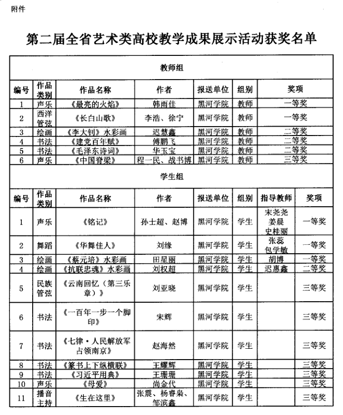 近日,黑龙省文化和旅游厅发布《关于印发第二届全省艺术类高校教学成果展示活动获奖节目和作品名单的通知》,beat365官网多名师生在本次教学成果展示活动中获得优异成绩。