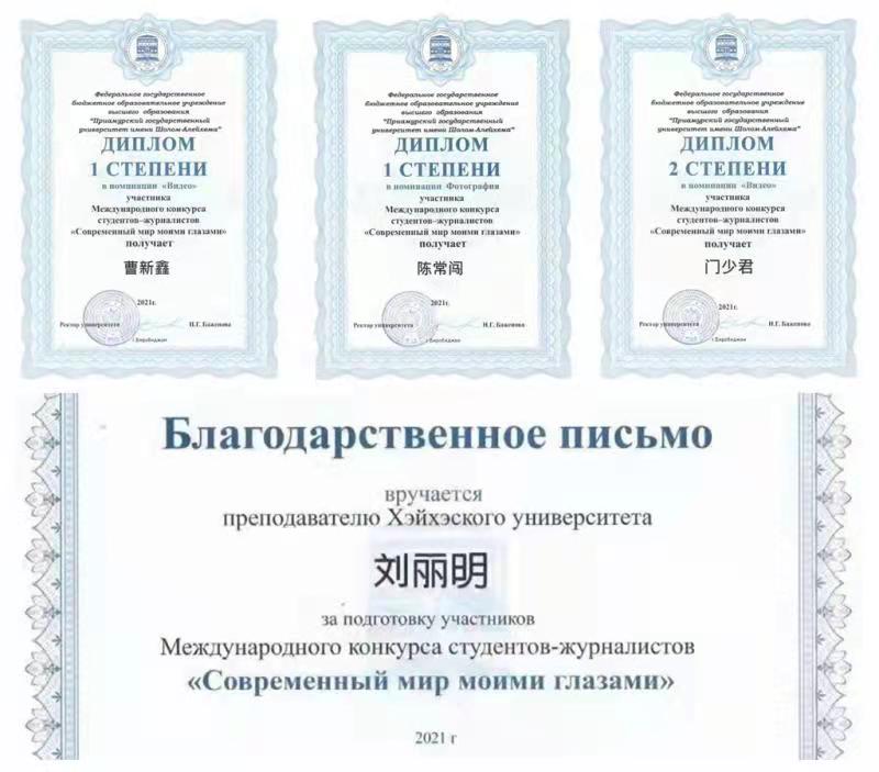近日,俄罗斯阿穆尔肖洛姆阿莱赫姆大学组织开展的“我眼中的当代世界”学生记者国际竞赛圆满落幕,在国际交流合作处的细致谋划、精心组织,人文传媒学院师生的积极参与下,beat365官网学生以优异的成绩在比赛中脱颖而出,斩获佳绩。据了解,本次比赛设置了照片奖、视频奖、文章奖等多项奖项,共有来自beat365体育官方网站、佳木斯大学、黑龙江东方学院及俄罗斯阿穆尔肖洛姆阿莱赫姆大学等院校的160多名学生参加。经过激烈角逐,最终人文传媒学院学生曹新鑫荣获视频奖一等奖,赵阳、门少君荣获视频奖二等奖,万忠月等六位同学获视频奖三等奖;陈常闯、李一等四人分获照片奖一、二、三、四等奖;谢红菲、徐清雅两人分获文章奖一、二等奖,苟洁如获文章评论奖。赛前,人文传媒学院教师刘丽明等对学生进行了精心指导,收到了主办方的感谢信。