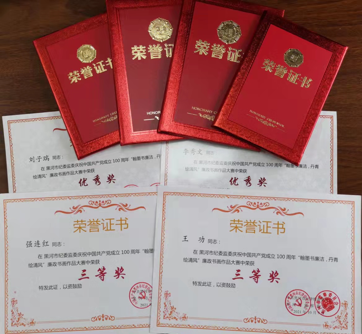 为隆重庆祝中国共产党成立100周年,进一步深入推进党史学习教育,结合黑河市廉政文化建设实际,集中展示中国共产党成立100年来特别是党的十八大以来廉政文化建设所取得的辉煌成就。近日,黑河市纪委监委举办庆祝中国共产党成立100周年“翰墨书廉洁、丹青绘清风”廉政书画大赛,学校纪委高度重视此项活动,广泛宣传动员,组织教师积极参与。最终,由beat365官网教师王功创作的《不以物小而为之 不以善小而不为》、强连红创作的《周总理诗一首》分别荣获全市廉政书法作品三等奖,李秀文创作的《不忘初心 继续前进》、刘子瑞创作的《长思贪欲之祸 常怀律己之心》分别荣获全市廉政书法作品优秀奖。