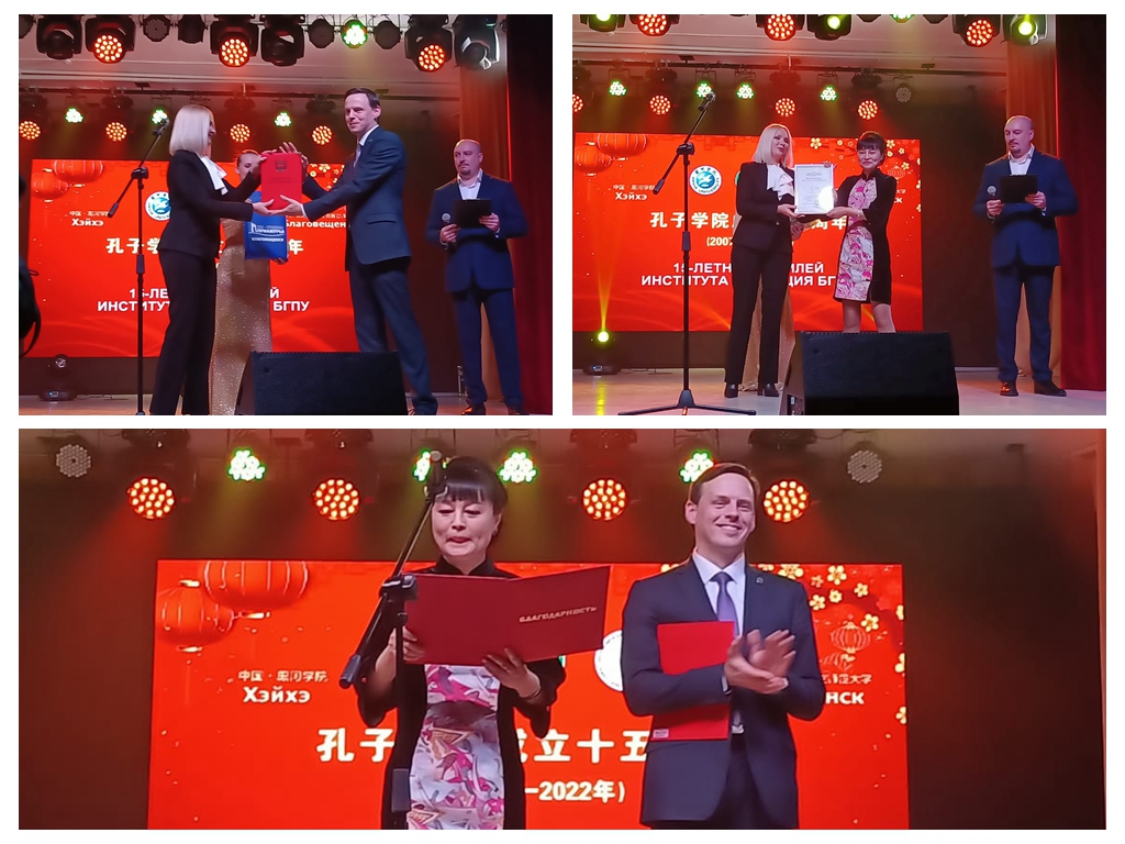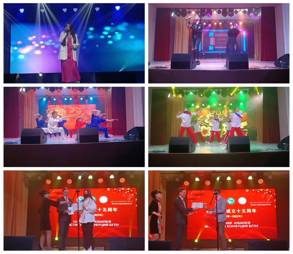 庆典中,孔子学院学员和布师大学生共同呈现了精彩的文艺演出。俄语歌曲《白桦的故乡》《我们的爱》、中文歌曲《小苹果》、阿穆尔州武术协会带来的武术表演、全能表演舞团的杂技《机场》等节目表达了对孔子学院十五周年的生日祝福,中俄友谊在歌声和舞蹈中传递。大会还为在加强中俄教育文化合作中作出突出贡献的中俄师生颁发了感谢信,并对庆祝孔子学院成立15周年毛笔书法大赛、硬笔书法大赛、绘画大赛、听写大赛的优秀学员进行了表彰奖励。