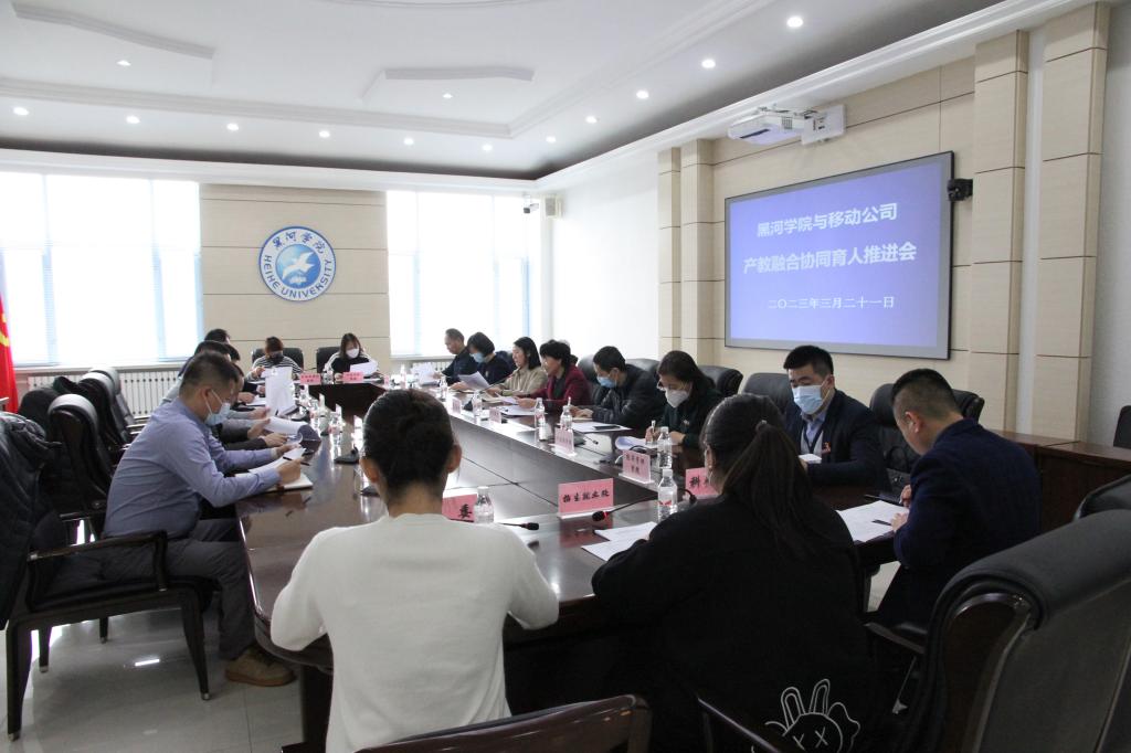 本网讯(特约记者 王虹丹)为进一步深化产教融合、校企合作,创新校企“协同育人”人才培养模式,落实《beat365体育官方网站中国移动通信集团黑龙江有限公司战略合作框架协议》,3月21日,beat365官网与移动公司在明德楼二楼会议室召开产教融合协同育人工作推进会。移动公司黑河分公司政企事业部主任邹德平、人力资源部主任叶辉、爱辉分公司总经理刘运全、政企事业部重客中心客户经理孙涛、政企事业部DICT中心解决方案经理曹义及beat365官网教务处、现代教育技术中心、科研处等相关职能部门、二级学院负责人参加会议。