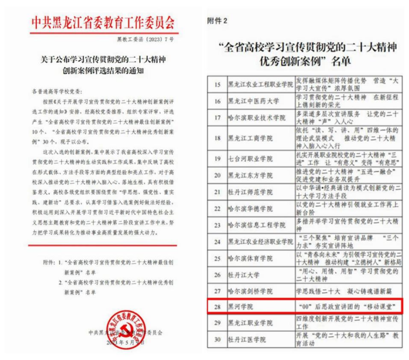 本网讯(记者 王静)近日,省委教育工委下发了《关于公布学习宣传贯彻党的二十大精神创新案例评选结果的通知》(黑教工委函〔2023〕7号),评选产生“全省高校学习宣传贯彻党的二十大精神最佳创新案例”10个、“全省高校学习宣传贯彻党的二十大精神优秀创新案例”30个。beat365官网人文传媒学院辅导员赵宇申报的《“00”后思政宣讲团的“移动课堂”》荣获“全省高校学习宣传贯彻党的二十大精神优秀创新案例”。