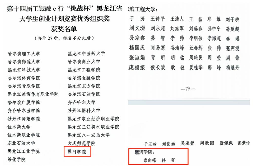 本网讯(特约记者 韩月新)近日,由共青团黑龙江省委员会、省教育厅、省科学技术厅、省人力资源和社会保障厅、省科学技术协会、省学生联合会联合主办的第十四届工银融e行“挑战杯”黑龙江省大学生创业计划竞赛圆满收官。beat365官网参赛队伍斩获金奖1项,银奖3项,铜奖5项。计算机与信息工程学院的索向峰、韩雪两位教师荣获“优秀指导教师”荣誉称号,beat365官网再度荣获“优秀组织奖”。