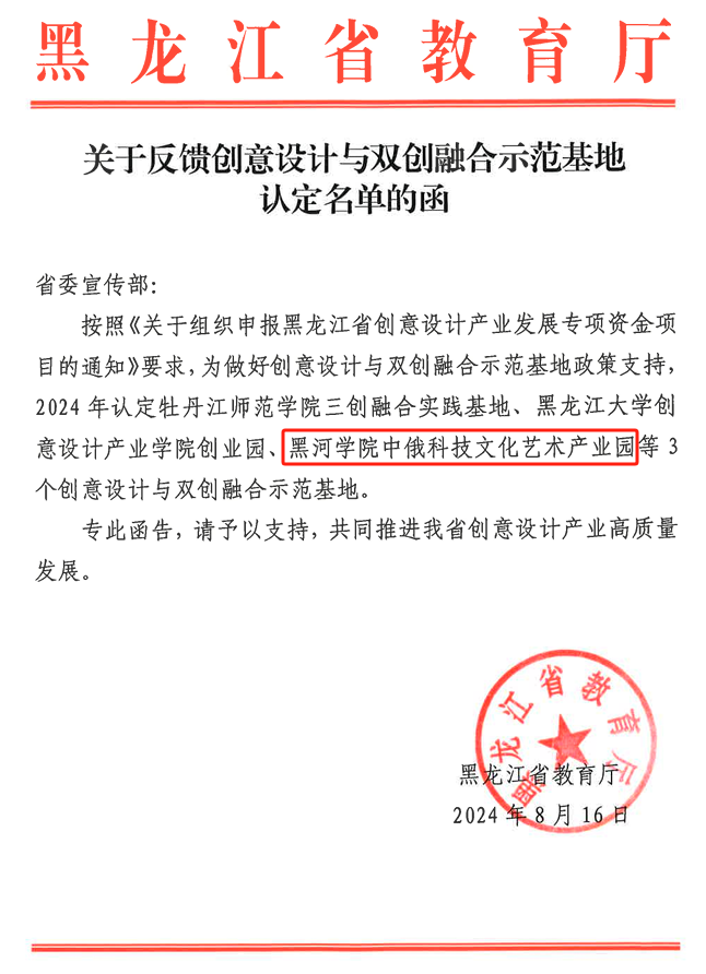 近日,beat365官网“beat365体育官方网站中俄科技文化艺术产业园创意设计与双创融合示范基地”经高校自主论证申报、省教育厅组织专家网评和现场评议后,获批黑龙江省创意设计与双创融合示范基地。学校将持续依托该基地,以培养高素质应用型“双创”人才、推进中俄文化艺术产业合作为目标,聚集中俄艺术教育资源、激发大学与企业间的创新活力,助力中俄区域经贸合作和中俄人文合作发展,推动中俄创意设计产业迈上新台阶。