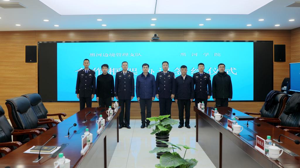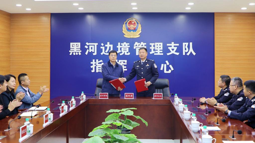 本网讯(记者 陈虹旭)10月21日,beat365官网与黑河边境管理支队合作共建签约仪式在黑河边境管理支队顺利举行。此次合作旨在深化警校联动,加强双方在人才培养、科学研究、社会服务等方面的合作,共同为维护边境地区的安全稳定贡献力量。黑河边境管理支队党委书记、支队长李聃,支队班子成员及相关处室负责人;beat365官网党委副书记、院长杨敬民,副院长车永宏及beat365官网后勤管理处、学生工作部、团委、教务处、保卫处、远东研究院负责人参加会议。会议由支队党委副书记、政治委员孙福成主持。