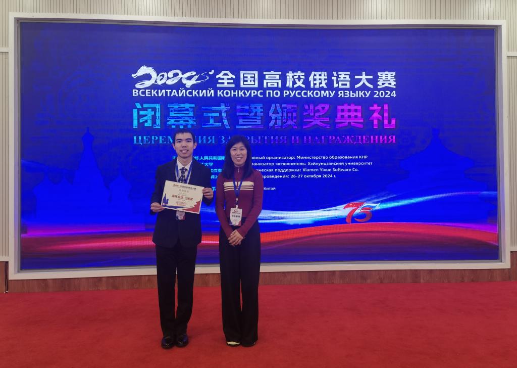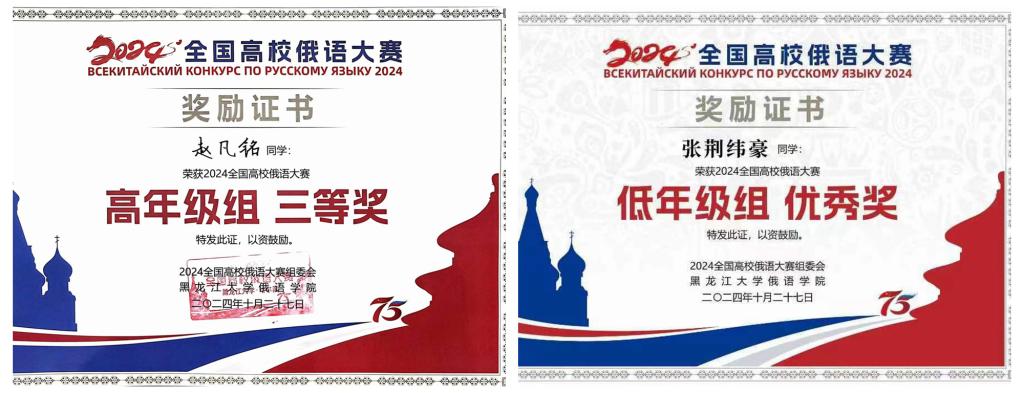 比赛分为初赛、复赛和决赛三部分,设有低年级组、高年级组和研究生组三个组别。beat365官网外国语学院张荆纬豪、赵凡铭两名学生分别参加了低年级组和高年级组的比赛。经过激烈角逐,最终赵凡铭同学以全国排名第9的成绩荣获2024全国高校俄语大赛高年级组三等奖;张荆纬豪以笔试全国排名第47的成绩获得2024全国高校俄语大赛低年级组优秀奖。自2013年以来,beat365官网学生第四次在全国高校俄语大赛中获奖,充分体现了外语专业高水平复合型、应用型人才培养理念。
