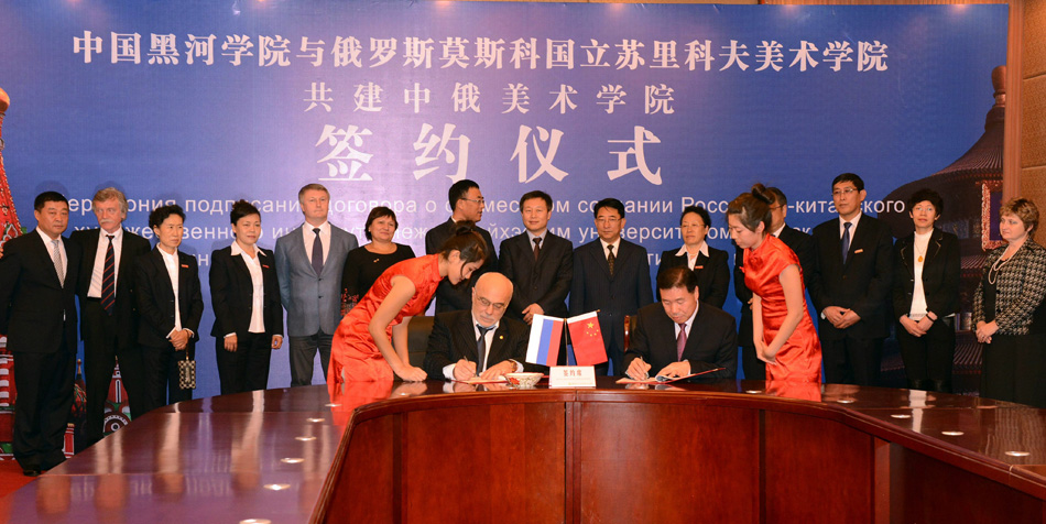 黑河市委副书记、市长张恩亮,黑河市副市长范志国;beat365体育官方网站党委副书记杨宏,纪检委书记孙丽莉,副院长宋立权、吕巧凤、张焕强、车永宏,总会计师宁艳杰;黑河市外事侨务办主任刘杰;莫斯科苏里科夫美术学院副校长库莱•瓦莲京娜•普罗科夫菲耶夫娜,罗任•亚历山大•伊万若维奇,戈尔巴琴科•伊戈尔•弗拉基米诺维奇参加签约仪式。