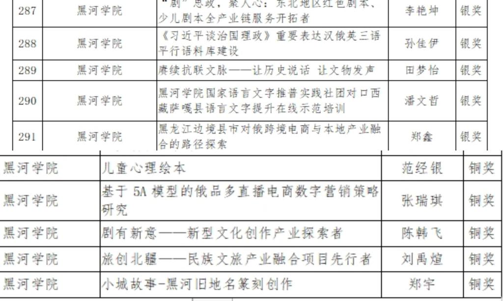 beat365官网15个项目参加省级奖项角逐,最终取得了银奖和铜奖各5项的优异成绩。其中《剧思政,聚人心:东北地区红色剧本、少儿剧本全产业链服务开拓者》《〈习近平谈治国理政〉重要表达汉俄英三语平行语料库建设》《赓续抗联文脉——让历史说话让文物发声》《黑龙江边境县市对俄跨境电商与本地产业融合的路径探索》等4个银奖项目被省教育厅推荐参选大学生新文科实践创新大赛国赛。